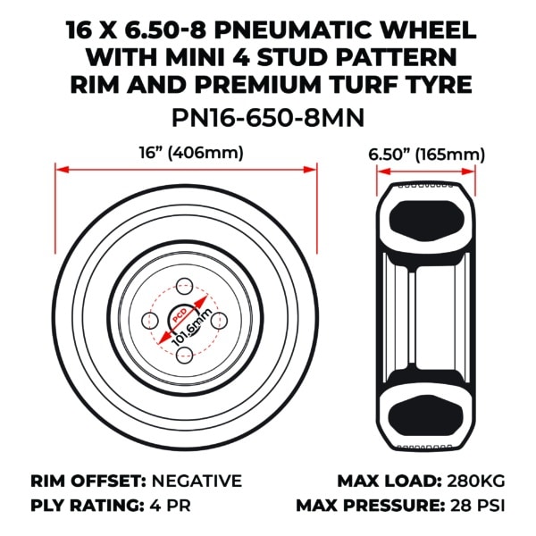 This compact turf wheel assembly combines durability with a smooth, low-impact ride, making it ideal for groundcare and mowing equipment. The 16×6.50-8 premium turf tyre is mounted on a Mini 4-stud steel rim (101.6mm PCD) with a 3/4″ negative offset, ensuring correct alignment and clearance across a wide range of rear axle setups.