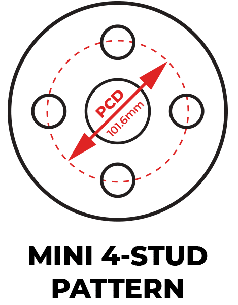A Mini 4-stud mounting pattern offers a compact stud layout that suits lightweight hubs and wheels. The Mini mounting pattern features 4 bolt holes on a 101.6mm (4”) circle. It contains 4 studs evenly spaced around the rim of the wheel and provides easy installation and alignment.