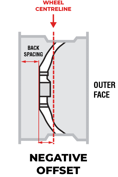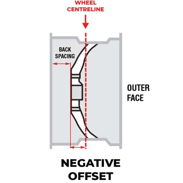 A Negative offset means that the mounting position of the wheel is located closer to the inner (chassis-side) face of the wheel. This moves the centre of the wheel and tyre further outward when mounted. Improving clearance between the wheel hub and other components. Commonly seen on a wide range of rear ride-on mower wheels.