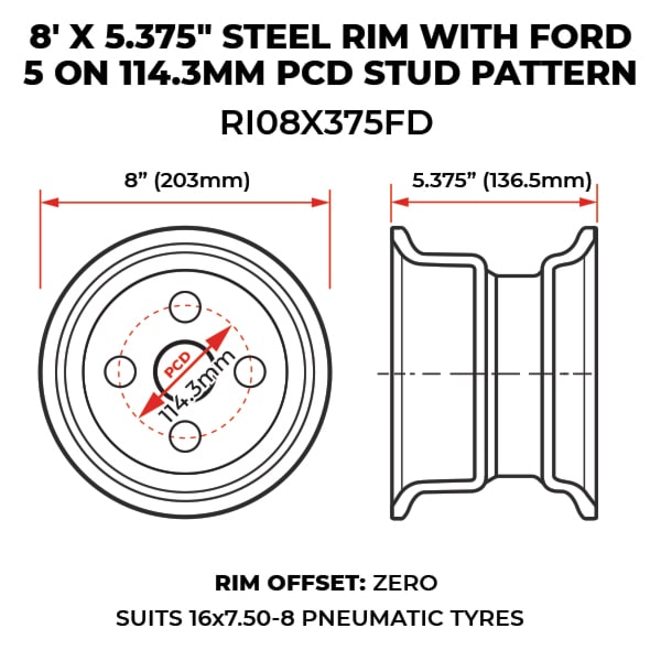 8″ x 5.375″ steel rim with Ford 5-stud 114.3mm PCD and zero offset. Suits 16×7.50-8 tyres. Ideal for trailers, utility carts, and general transport equipment.