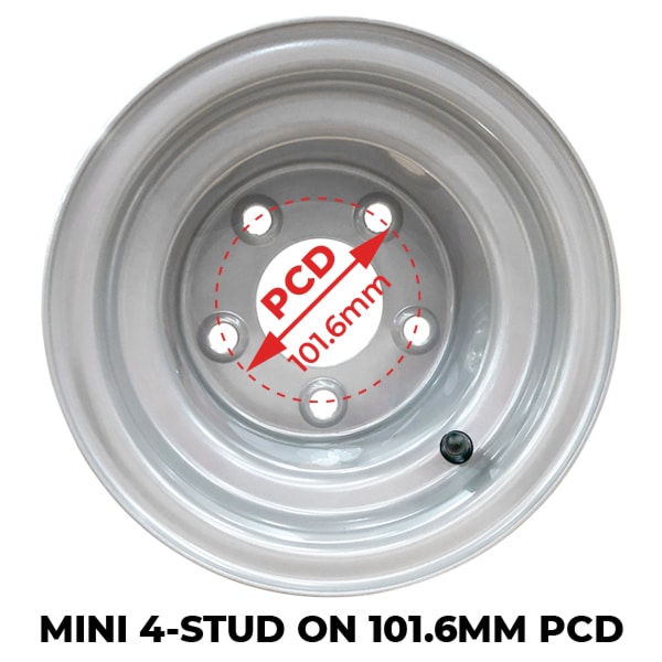 A Mini 4-stud mounting pattern offers a compact stud layout that suits lightweight hubs and wheels. The Mini mounting pattern features 4 bolt holes on a 101.6mm (4”) circle. It contains 4 studs evenly spaced around the rim of the wheel and provides easy installation and alignment.