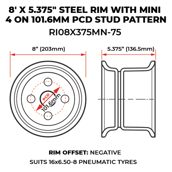 8″ x 5.375″ steel rim with Mini 4-stud 101.6mm PCD and 3/4″ negative offset. Suits 16×6.50-8 tyres and is ideal for compact trailers, mowers, and turf equipment.