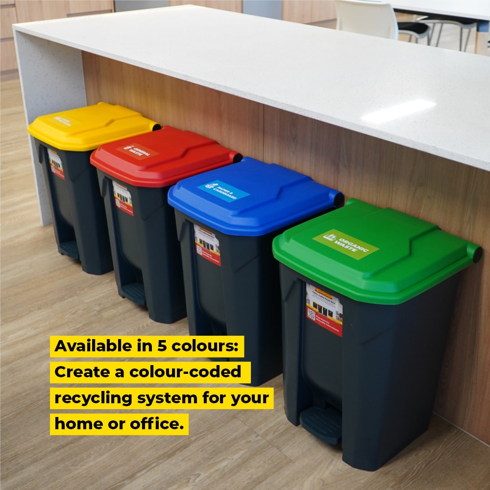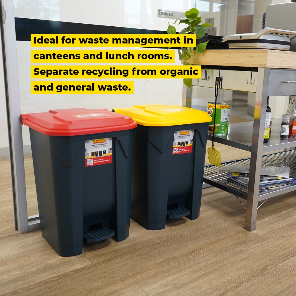 In Australian systems, grey lids are often used for general waste where specific colour coding isn’t required. This makes the bin a flexible option for public zones, hallways, or facilities with mixed-use bins. For teams managing full waste segregation systems, matching bins are available in red, green, yellow and blue. Signage can be downloaded or added using Richmond’s Colour Coded Waste Label Set.