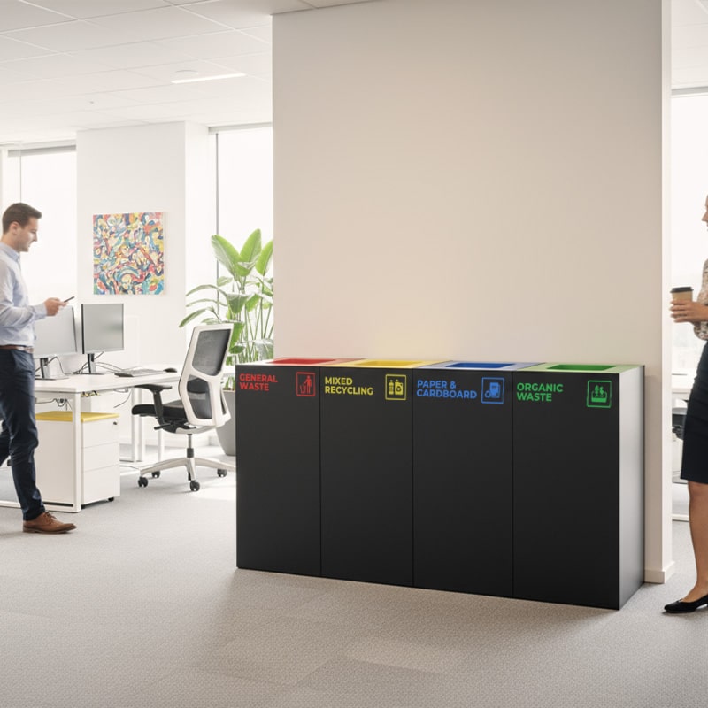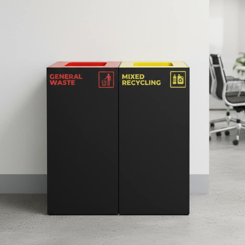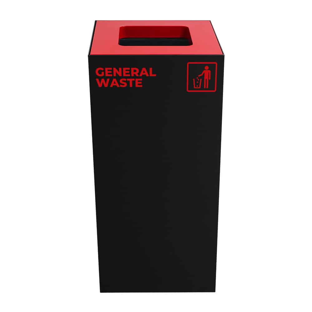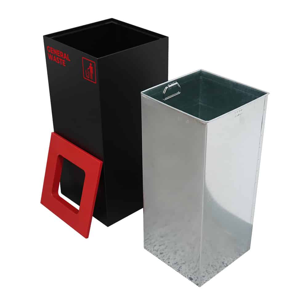 Compact 52L indoor waste recycling station with red lid insert for general waste. Built from durable matte black galvanised steel for offices, schools, shopping centres, and other shared indoor spaces.